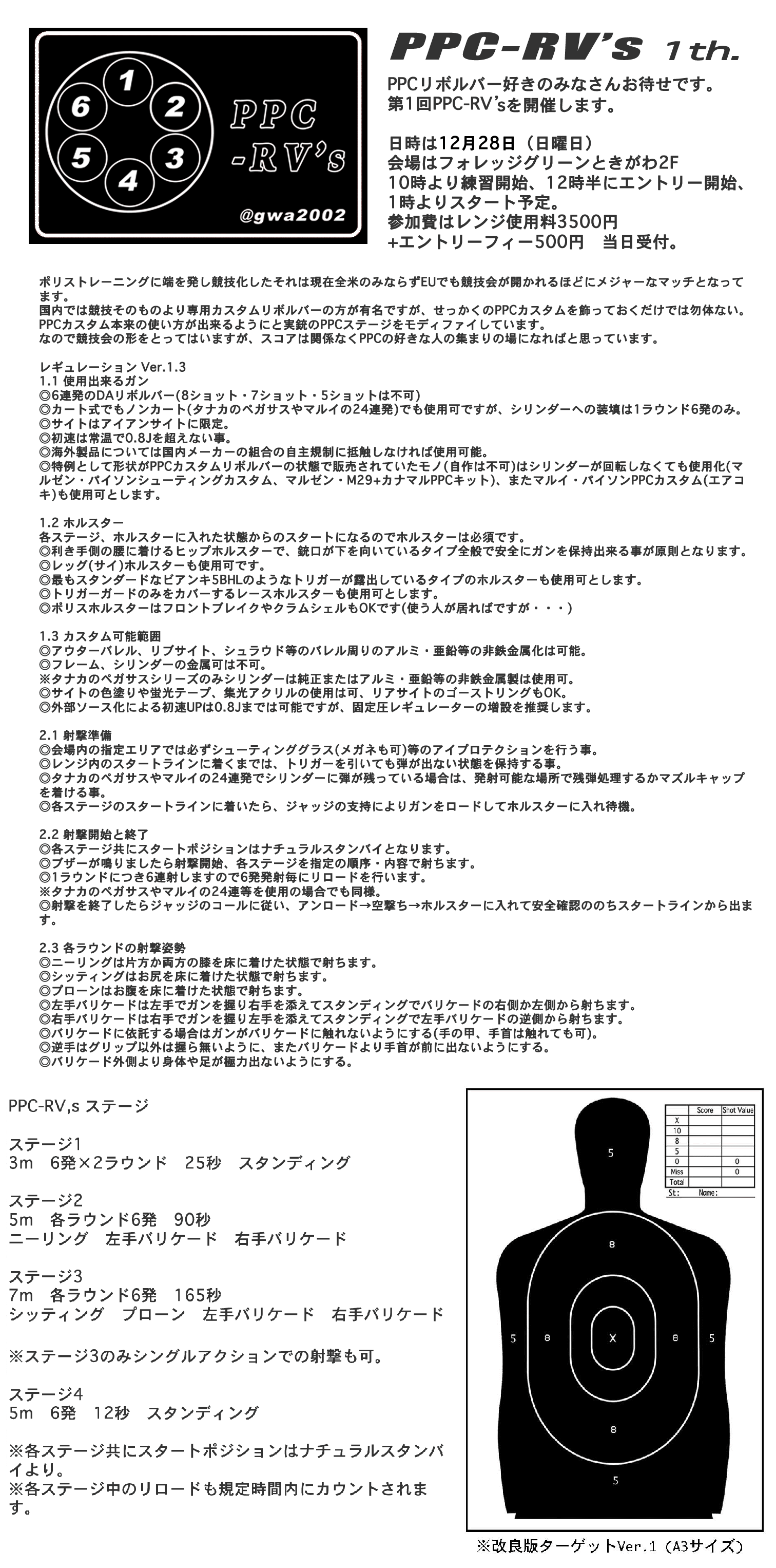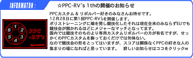 11/26 PPC-RV's 1th開催のお知らせ。 8/08 AXタイプ・ホルスター(インサートブロック無しBK)が再入荷しました。 8/01 エイトラウンズ8th開催のお知らせ。 7/23 タナカ S&W系 Kフレーム用 外部ソースキットVer2が再入荷しました。 7/22 タナカ M327・M627用 外部ソースキットVer2が再入荷しました。 7/01 マルイ ハイキャパ用 サムガード付きアンビサムセフティ(BK・SV)が入荷しました。 7/01 「スマホ割アプリ」による発送が再開しました。 5/26 タナカ S&W系 Kフレーム用 外部ソースキットVer2が入荷しました。 5/26 タナカ M327・M627用 外部ソースキットVer2が入荷しました。 5/21 マルイ・グロック17他用 アキュバレルNが入荷しました。 5/20 マルイ 51NAVY用スチールロックレバーとバレルウエイトが入荷しました。 5/07 マルイ ソーコムMk23(固定ガスガン)用カービンキットRが入荷しました。 5/07 マルイ ヴォーパルバニー & AM.45用アキュバレルセットNが入荷しました。 4/25 トップページにGW休業のお知らせをアップしました。 4/14 タナカ S&W系 外部ソースキット用オンラインマニュアルを更新しました。 4/10 タナカ S&W系 Kフレーム用 外部ソースキットが入荷しました。 4/10 タナカ M327・M627用 外部ソースキットが再入荷しました。 4/04 レースホルスター用 IPSCシューターズベルトLが再入荷しました。 4/02 RM/AXタイプ用 ホルスターパーツ(マグネティックSTI)が再入荷しました。 3/05 マルイ ハイキャパ用 アルミニウム・グリップセフティー(GD)が入荷しました。 3/05 マルイ ハイキャパ用 アルミニウム・グリップセフティー(BK)が再入荷しました。 2/18 タナカ M327・M627用 外部ソースキットが再入荷しました。 2/17 AXタイプ・ホルスター(インサートブロック無しBK)が再入荷しました。 2/13 レースホルスター用 IPSCシューターズベルトMが再入荷しました。 2/13 トップページに臨時休業のお知らせをアップしました。 1/09 マルイ デトニクス用 軽量樹脂プラグがマニアックシリーズに切り替わりました。 1/06 トップページに新春セールの告知をアップしました。 1/02 トップページに新年の挨拶をアップしました。 2025 12/24 トップページに年末・年始の営業のお知らせをアップしました。 12/02 DAAリンクスベルト用 ラチェット バックルが再入荷しました。 12/02 DAA Alpha-X用 インサートブロック(NF・KF)が再入荷しました。 12/02 DAA Alpha-X用ボールジョイント(エクステンション)が再入荷しました。 12/02 DAA Alpha-X用サイパッドが再入荷しました。 12/02 DAA リンクスベルト用ハーフリンク・エクステンションが再入荷しました。 12/02 トップページに臨時休業のお知らせをアップしました。 11/26 PPC-RV's 0th開催のお知らせ。 11/14 マルイ ハイキャパ用ライトウェイトアルミブリーチが再入荷しました。 10/17 グリーンガス・レギュレーター用G.G.R ホルダー(ブラック)が再入荷しました。 10/16 AXタイプ・ホルスター用Tプレート・アダプター(ブラック)が入荷しました。 10/16 RM/AXタイプ用 インサートブロック(shadow 2)が入荷しました。 10/01 レターパックの料金変更に伴い料金表ページを修正しました。 9/26 タナカ M327・M627用 外部ソースキットが再入荷しました。 8/27 グリーンガス・レギュレーター用G.G.R ホルダーが再入荷しました。 8/26 AXタイプ・ホルスター(インサートブロック無しBK・BL)が再入荷しました。 8/05 エイトラウンズ7th開催のお知らせ。 7/23 タナカ M327・M627用 外部ソースキットが入荷しました。 7/04 マルイ ハイキャパ用 アルミニウム・グリップセフティー(BK・SV)が入荷しました。 7/01 PISCO製 固定圧レギュレーター(RVFUP4-4-0.45)が再入荷しました。 6/27 マルイ・グロック17用 5KUマグウェル(ブラック)が入荷しました。 6/27 マルイ・グロック互換 32連アルミマガジンが再入荷しました。 6/25 マルイ ハイキャパ用 スチール・ハンマー(Match Grade・SV Infinityタイプ)が入荷しました。 6/25 マルイ ハイキャパ用 スチール・ハンマーDVC-Xタイプ(BK/SV)が再入荷しました。 6/20 タナカ M627/M327用 アウターバレルキット Aタイプが入荷しました。 6/10 トップページに臨時休業のお知らせをアップしました。 6/10 マルイ ハイキャパ用 ハイキャパのピアス(グリーン・スカイブルー)が再入荷しました。 5/07 BATON airsoft BG-17用アサルトフレームが入荷しました。 4/29 トップページに業務再開とGWについてのお知らせをアップしました。 4/04 EMG STACCATO (C2/P) 2011用 樹脂スライドセットが入荷しました。 2/19 マルイ グロック17Gen3用アサルトフレームH4が入荷しました。 2/01 新春セールが終了しました。 1/09 トップページに新春セールの告知をアップしました。 2024 12/25 マルイ ハイキャパ5.1用 次世代アキュコンプ(ゴールド)が再入荷しました。 12/25 マルイ ハイキャパ用 スチール・ハンマー(QBタイプ)が再入荷しました。 12/25 マルイ・デザートイーグル用ドレスアップセット(スカイブルー)が再入荷しました。 12/25 トップページに年末・年始の営業のお知らせをアップしました。 12/20 マルイ・グロック互換 32連アルミマガジンが入荷しました。